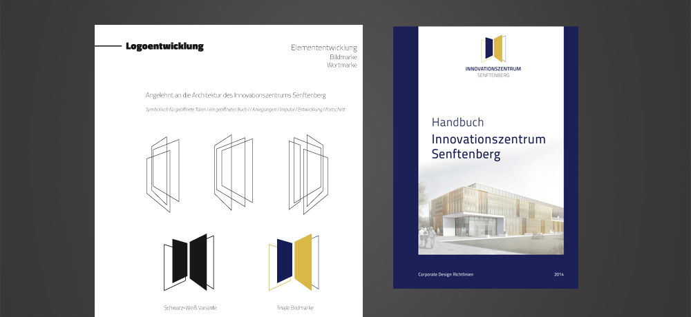 In einem mehrstufigen Prozess entwickelte Wieduwilt Kommunikation ein Logo, dass sich in der Farbgebung dem markant verkleideten Gebäude anpasst. Die Form symbolisiert offene Türen ebenso wie ein aufgeschlagenes Buch als Zeichen für die Verbindung zur Wissenschaft. Die moderne Schrift und die klaren Farben spiegeln die Intention der Gründer des Innovationszentrums wieder.